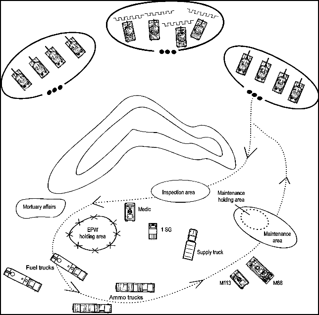 These sites are important elements of task force resupply operations. For a more detailed discussion of Class IV/V supply points and mine dump operations, refer to FM 90-7. |