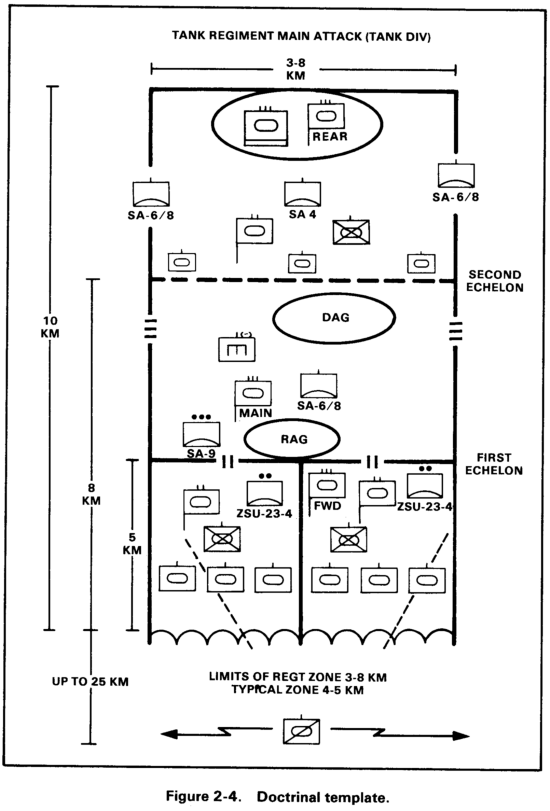 (2) When such detailed OB data is not available, the primary threat evaluation tool is a generic doctrinal template (see Figure 2-4). A doctrinal template depicts the enemy doctrinal deployment for various types of operation without the constraints imposed by weather and terrain. Specifically, composition, formation, frontages, and depths are displayed.