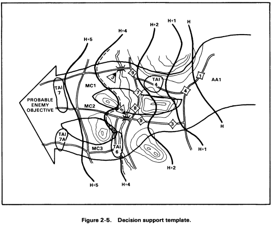 (5) The decision support template is the final template of IPB. It does not dictate decisions to the commander, but rather identifies critical events and threat activities relative to time and location which may require tactical decisions. Critical events and threat activities are displayed on the decision support template using target areas of interest, decision points, and time lines (Figure 2-5).